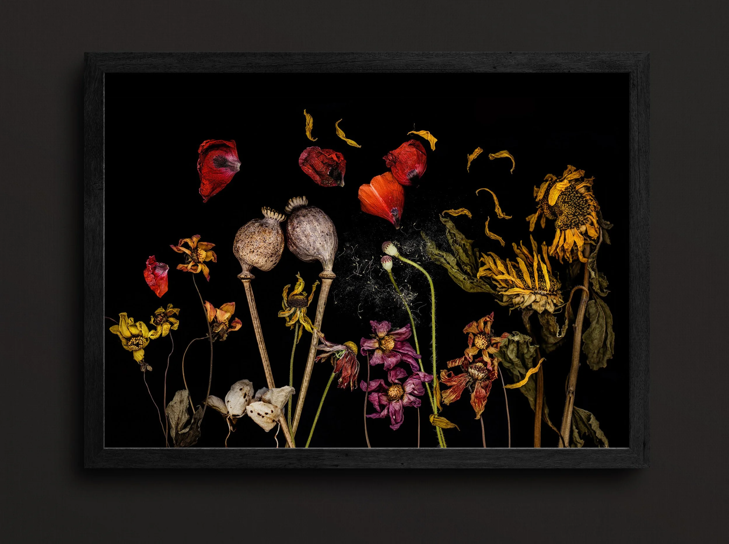 Far-right, you have the sunflower instructors. Beautifully flamboyant, they lead the class with gusto - no holding back there. The poppy couple are following their lead, a quiet competition going on there maybe? The little orchids are whispering to each other, what do you think they may be saying? Sharing a secret, or having a cheeky flirt? The rudbeckias are getting adventurous and spinning, spinning, spinning. The dahlias are making sure they are claiming their space. and showing off their beautiful colors.